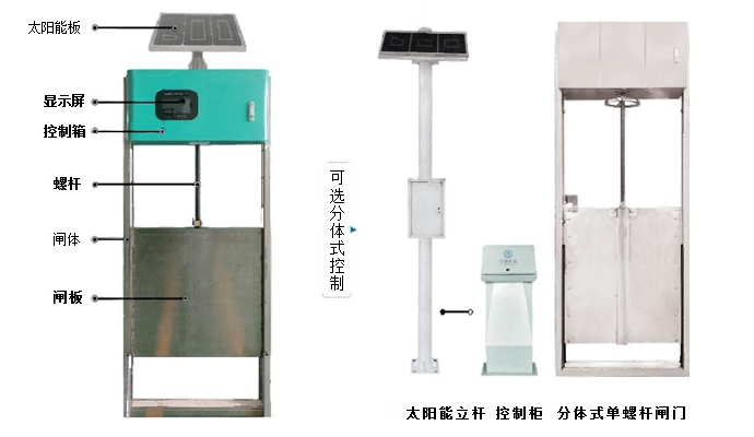 单螺杆智能闸门采用单点螺杆驱动结构,将闸体、控制系统和供电单元集成于一体,通过螺杆的精 确传动实现闸门的平稳升降,具有闸门控制精度高、太阳能驱动、无线通信等特点。具备数据采集、传 输、智能控制与远程监控等功能。也可分体控制,集本地与远程控制于一体,操作方便运行稳定。
